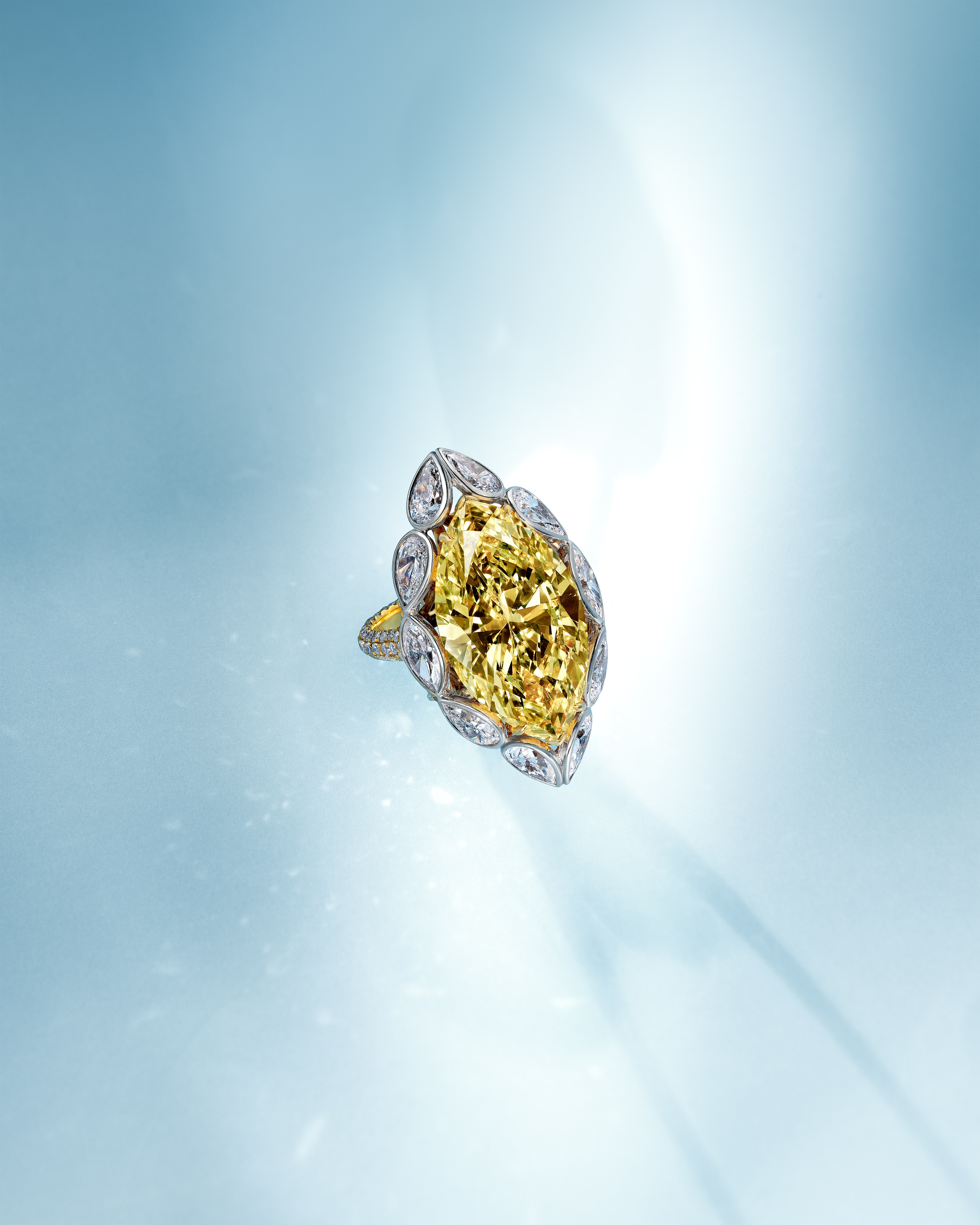 A captivating Yin Yang formation of two pear-shaped Fancy Intense Yellow diamonds, enveloped by a contrast of Fancy Yellow and D-F diamonds.
