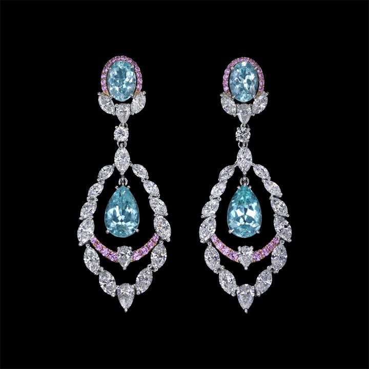 Eighteen oval-shaped Paraiba tourmalines of 2.98 carats in total sets the foundation of this iridescent-like beauty. Each earring features Paraibas, pink and white diamonds that outline a flower shape. Draped from the flower-like stud of each earring is a large pear shape formed using the same combination of gems to create a jaw-dropping statement.
