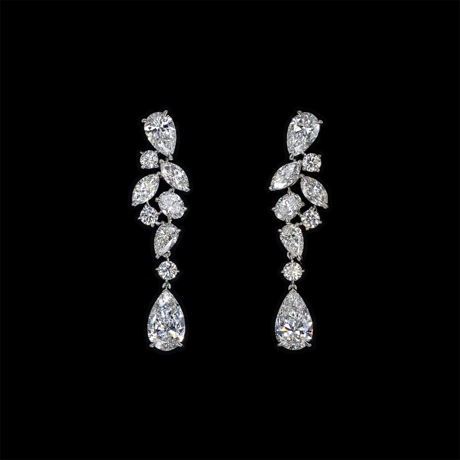 16 D-F VVS1-VS1 Pear Shape diamonds come together to form this vine-like cluster pair, weighing a total of 3.49 carats.