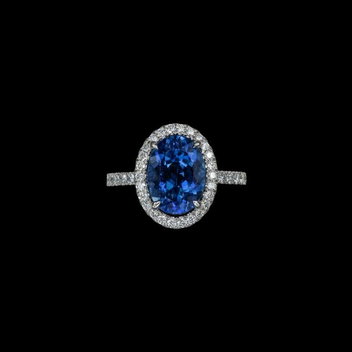 A timeless proposition made for everyday attire. This oval cut Nigerian Paraiba tourmaline of 5.02 carats sits encased by sparkling round diamonds pavé in a slender halo frame completed with a double split shoulder shank.