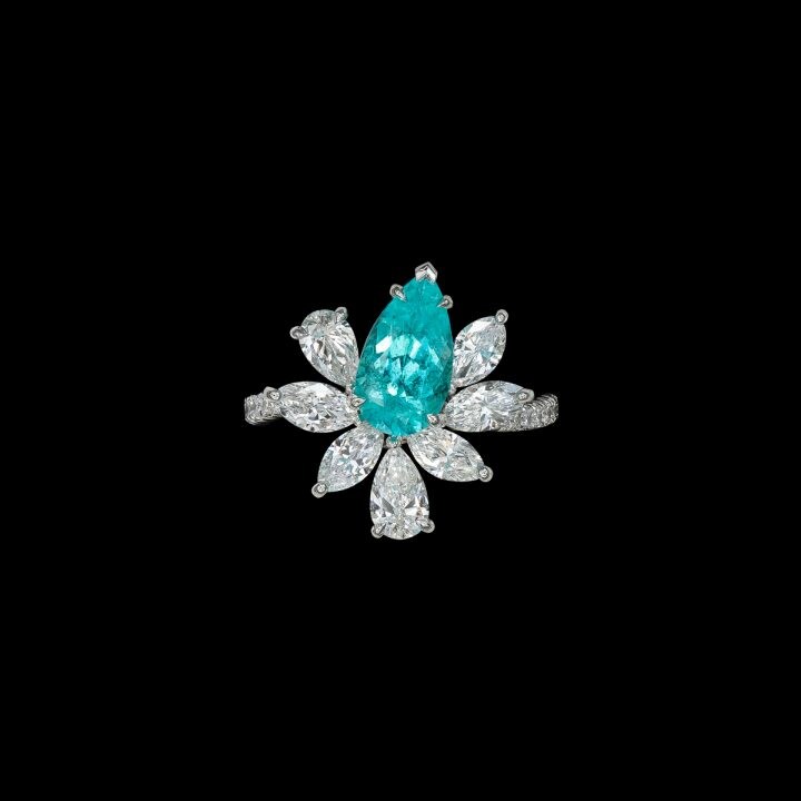 Finding beauty in irregularity, the oval-shaped 0.72 carat Paraiba tourmaline is set around pear-shaped diamonds of various sizes to mimic the unusually shaped petals of exotic, vibrant flowers. The greenish-blue hues of the Paraiba are beautifully highlighted by the icy white nature of diamonds.