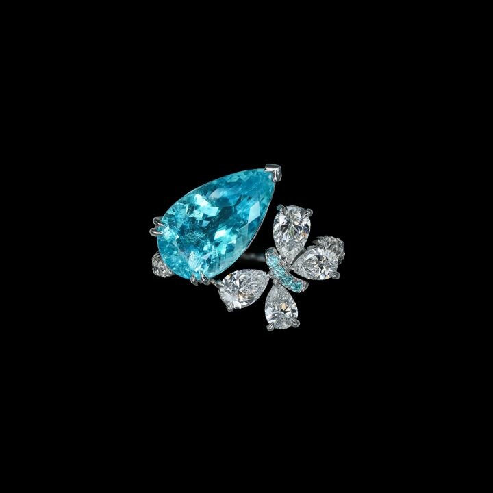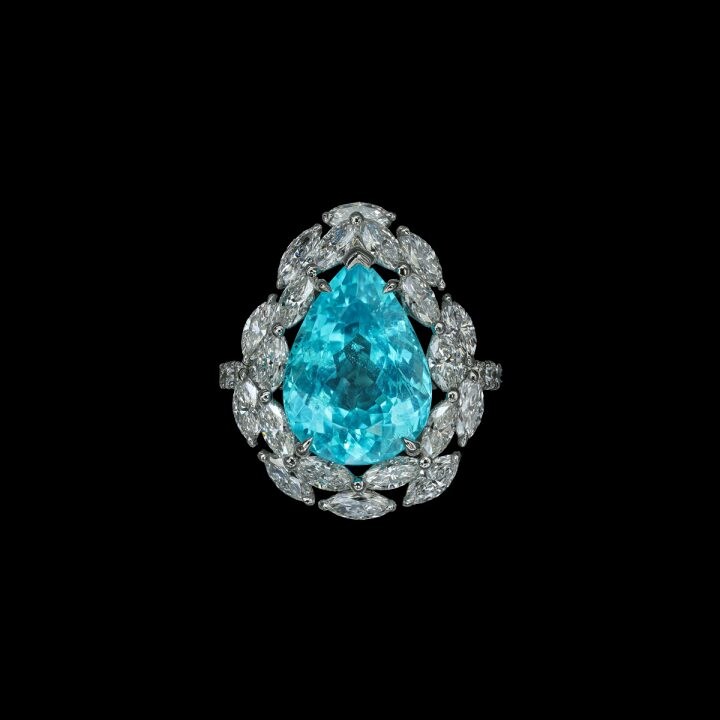 A pear-shape Paraiba of over 5 carats, masterfully set amongst a frame of marquise diamonds. ?
