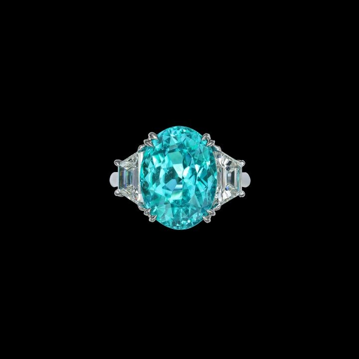 An inviting design reveals the full beauty of a Nigerian oval cut Paraiba tourmaline of 14.79 carats. Its intricacy lies in the bridge, where tiers of brilliant cut diamonds create an elongated profile. For extra drama, the band is encrusted with rows of fine Paraibas and diamonds.