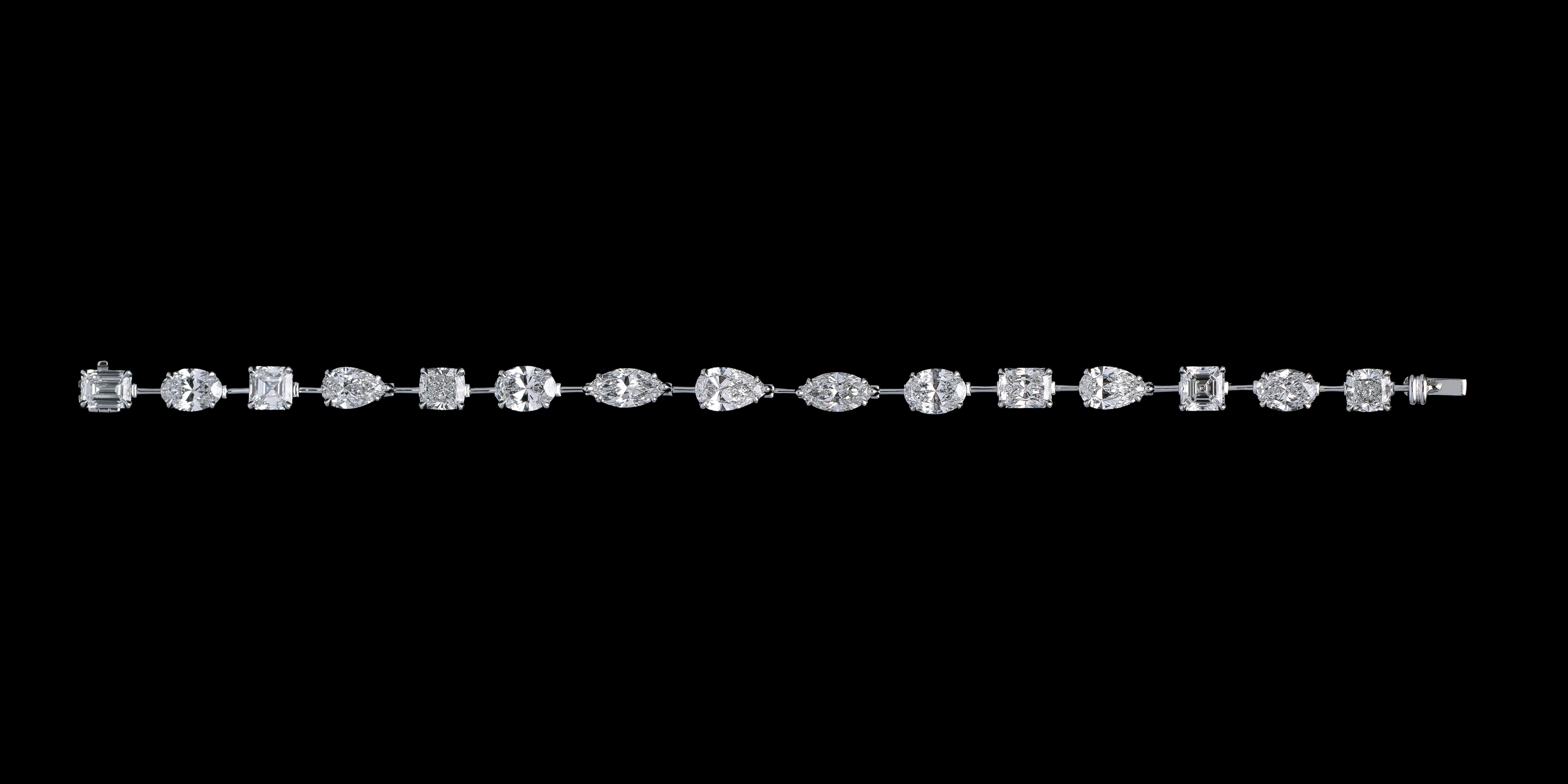 15 mixed cut of solitaire diamonds come together in this amazing piece. Each emerald, square, pear, oval, and cushion shaped diamond weighs over one carat each, making this literally flawless piece unforgettable.