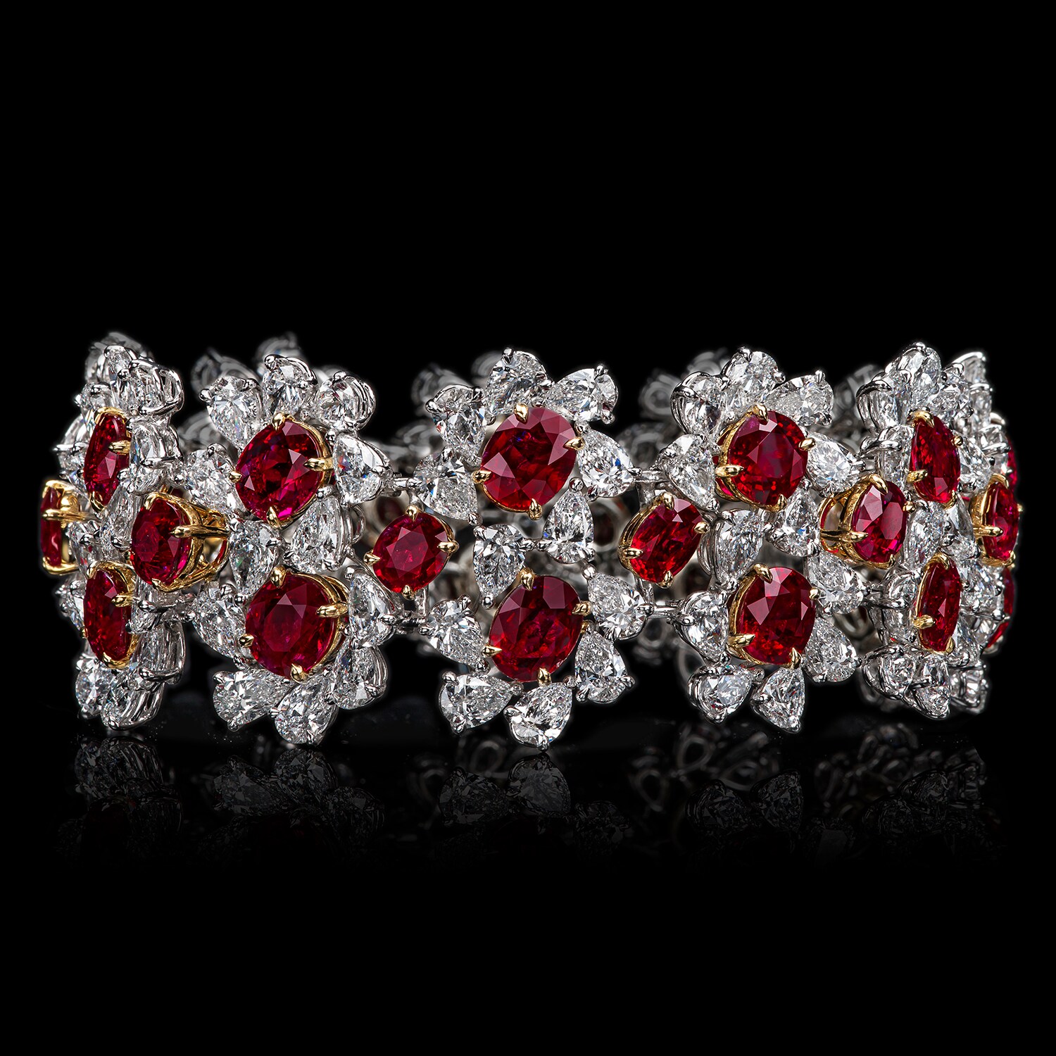Sophisticated designs meets modernity with these ruby pieces. Highly desirable and exceptionally rare, showcased here we have a 4.10+ct unheated Burmese ruby ring , complemented by half moon side diamonds. The perfect pairing with this straight row ruby bracelet.