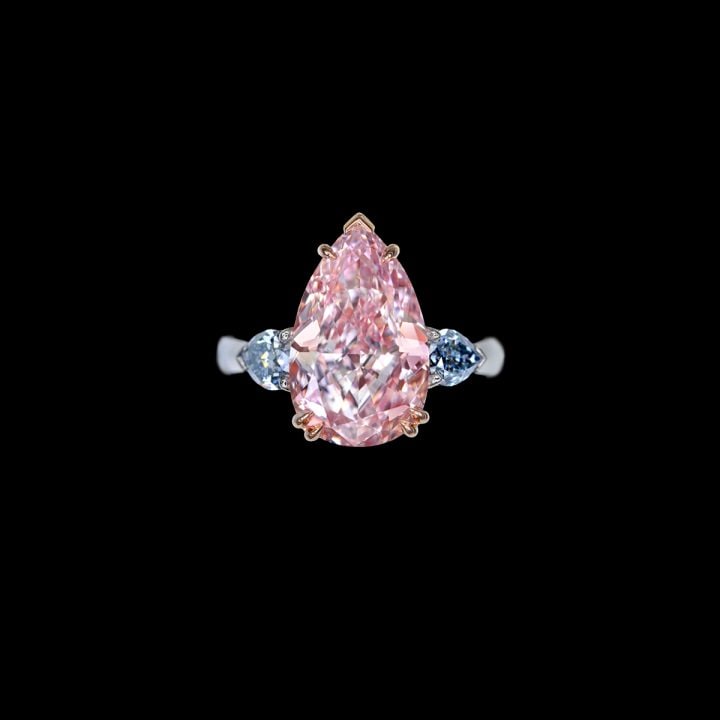 An impressive over seven carats pear-shaped fancy intense pink diamond with unparalleled clarity is highlighted with contrasting pear-shaped fancy intense blue diamonds on the sides. Honoring the beauty of these exceptional stones, the band design is stripped down to a minimal platinum setting.