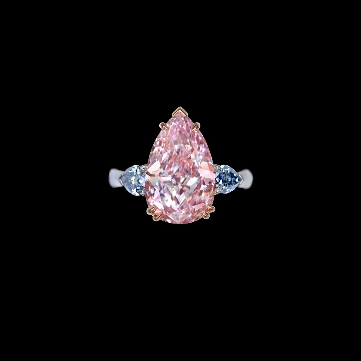 An impressive over seven carats pear-shaped fancy intense pink diamond with unparalleled clarity is highlighted with contrasting pear-shaped fancy intense blue diamonds on the sides. Honoring the beauty of these exceptional stones, the band design is stripped down to a minimal platinum setting.